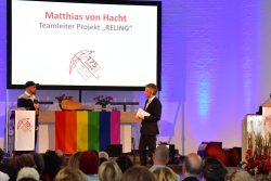 Matthias von Hacht von RELING veranschaulichte, worum es in dem Projekt geht und konnte dem Publikum davon erzählen, wie wichtig neue Räumlichkeiten für das Projekt sind – weil sich 2021 und 2022 leider nicht ergeben hat, das direkt anliegende Gebäude instandsetzen zu dürfen und für die Nutzerinnen und Nutzer von RELING in Betrieb zu nehmen. Bisher gibt es nur kleine Räume für die Beratung und es gibt die Straßensozialarbeit – RELING möchte gerne wichtige Gruppenangebote etablieren, Duschen, eine Kleiderkammer und Verpflegung zur Verfügung stellen, Computerzugänge ermöglichen und Arbeitsangebote im Bereich von gemeinwohlorientierten Tätigkeiten im kommunalen Umfeld schaffen.