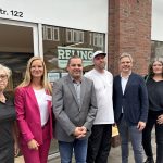 – im Foto: Tanja Becker (Jobcenter team arbeit hamburg), Natja Berg (Pestalozzi-Stiftung Hamburg), Bezirksamtsleiter Ralf Neubauer, Matthias von Hacht (Reling), Kai Gosslar (Pestalozzi-Stiftung Hamburg) und Britt Lemke